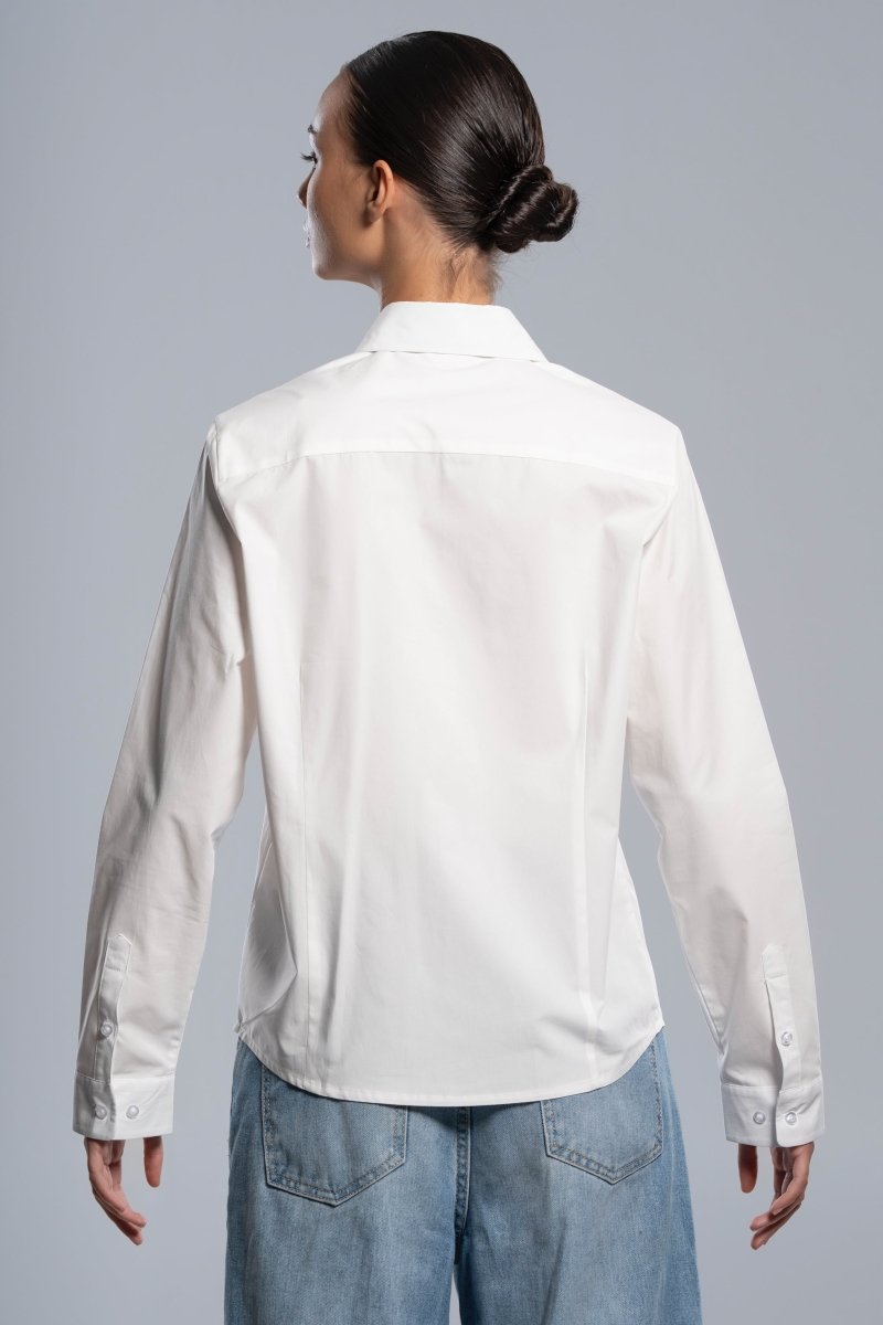 Relaxed style with a feminine and sporty touch. This pure white women's shirt stands out for its clean design and natural fabric, offering a comfortable, versatile and easy to combine garment.